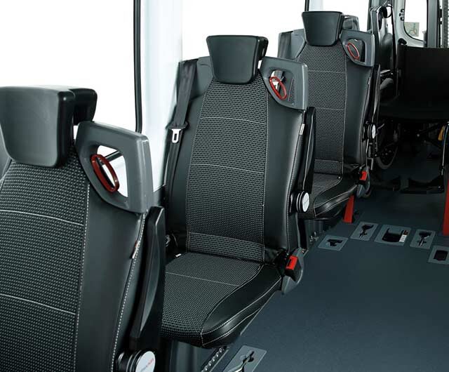 Our flooring systems and seats transform every minibus into a fully versatile, wheelchair accessible vehicle. Seats can be folded or rotated away and wheelchairs secured quickly and efficiently, always meeting the highest European safety standards. This way you maximize the flexibility of your fleet and ensure every passenger travels with ease.