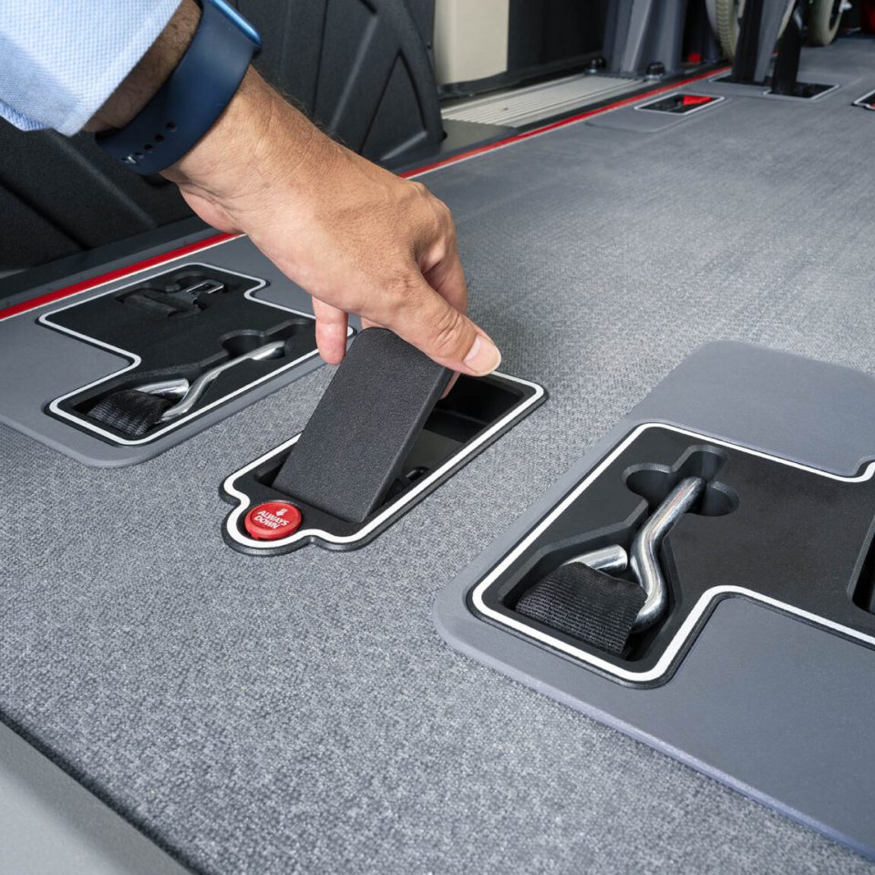 • Maximum flexibility: with our innovative flooring systems and seats you can switch effortlessly between wheelchair spaces and seats, optimizing your vehicle’s layout for every trip.