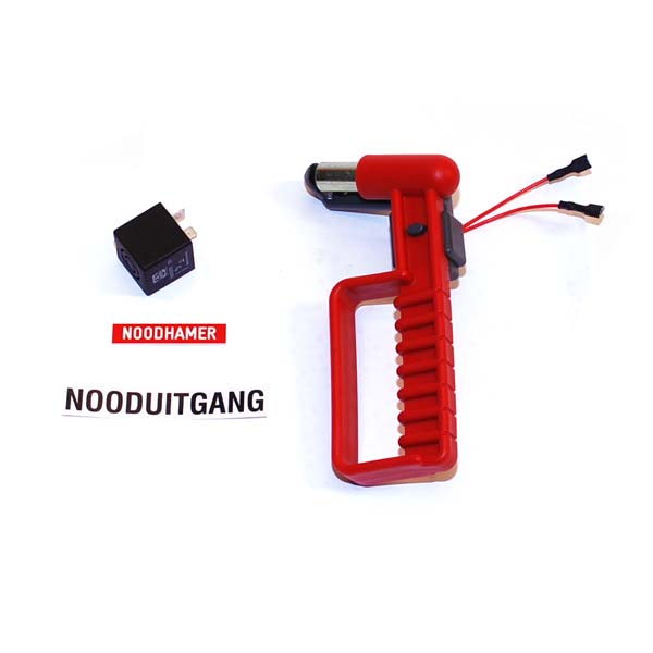 Set includes hammer and holder, switch, buzzer, “emergency hammer” label, and “emergency exit” sticker.